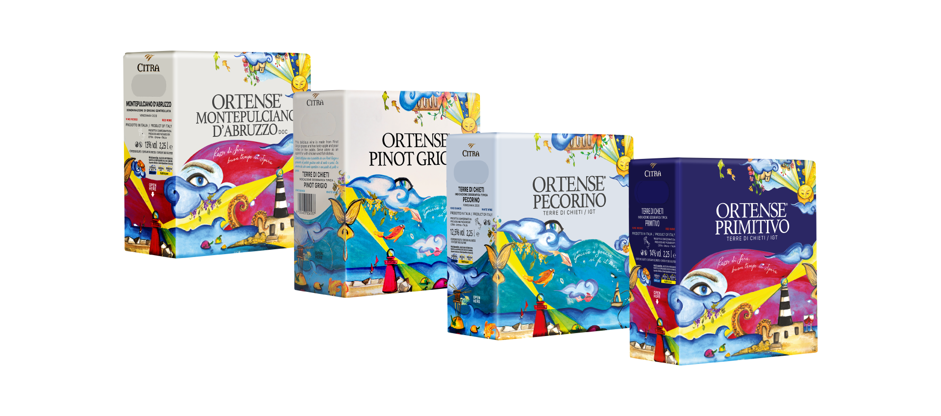 Ortense nasce da un’intuizione del nostro team creativo, con l’obiettivo di racchiudere in uno scrigno prezioso i nostri vini a denominazione controllata e indicazione geografica. Un packaging che racconta in maniera creativa il nostro territorio, in cui sono stati inseriti tutti i simboli della città di Ortona reinterpretati in chiave allegorica e illustrativa. È un’opera creativa visionaria e sognante declinata in diversi segmenti di quadri, uno per ciascun vitigno, che, se affiancati, generano una visione unica della città di Ortona. Nel cielo si fondono il sole e la luna per indicare un giorno e una notte senza fine, in un luogo senza tempo e senza spazio, in cui dalle nuvole pendono dei grappoli d’uva, i pesci “volano” nel cielo e gli acini d’uva galleggiano nel mare. La centralità è rappresentata dai “fari” che illuminano il porto e, oltre ad indicare la direzione, simboleggiano un punto di riferimento e di arrivo, sono metafore di guida, sicurezza, tenacia e raggiungimento di un obiettivo.